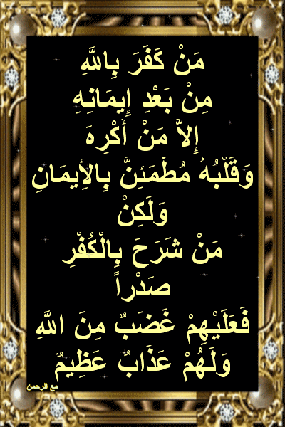م ن ك ف ر ب الل ه م ن ب ع د إ يم ان ه إ ل ا م ن أ ك ر ه و ق ل ب ه م ط م ئ ن ب ال إ يمان النحل 106
